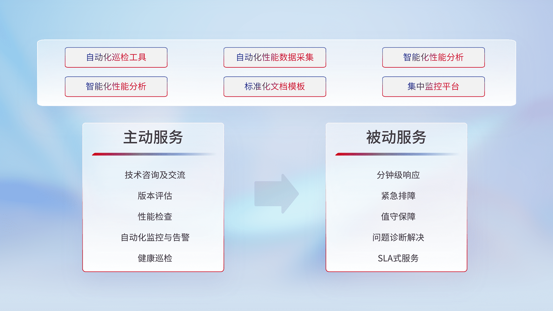 智能化工具和标准化文档,,,,保障服务质量,,,,提供主动服务(包含技术咨询、、版本评估、、、性能检查、、、自动化监控与告警、、健康巡检)和被动服务包含(分钟级响应、、、、紧急排障、、、、值守保障、、问题诊断解决、、、SLA服务)。。。
